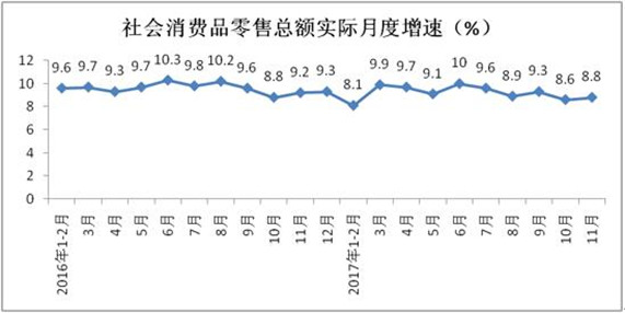 从实际增速来看,1-11月份增长9.1%,比2016年同期回落0.2个百分点。其中,11月份实际增长8.8%,增速较2016年同期下降0.4个百分点,较10月提高0.2个百分点。
