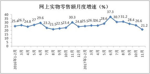 9到11月份,网上实物零售额同比增速呈逐月放缓趋势。11月份虽然有双十一的带动,网上实物零售额同比增长21.2%,增速较2016年同期放缓9.1个百分点,较10月份放缓5.4个百分点。