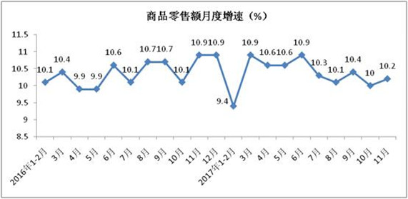 1-11月份,城镇消费品零售额实现284536亿元,同比增长10%,增速比去年同期回落0.3个百分点。其中,11月份城镇消费品零售额同比增长9.9%,增速较2016年同期放缓0.9个百分点,较10月份提高0.1个百分点。