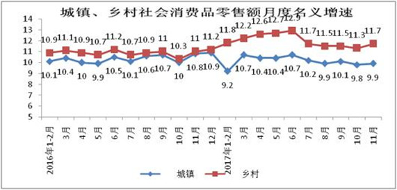 五、1-11月份乡村消费品市场增速快于2016年同期,城镇市场增速有所回落。