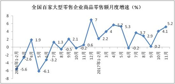 六、1-11月份大型零售企业商品零售额增速快于2016年同期,11月份增速继续提升。