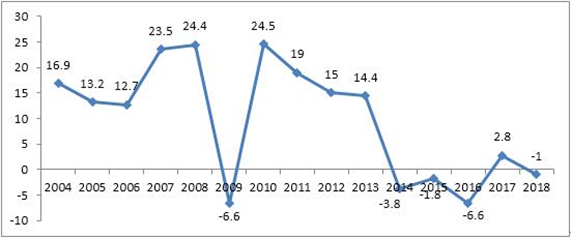 图表 1 2004-2018年春节黄金周全国百家重点大型零售额同比增速(%)