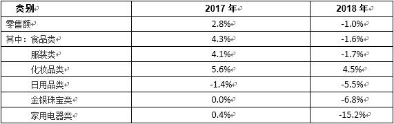 主要商品销售方面,各品类商品零售额增速均不及去年同期,食品零售额同比下降1.6%,增速低于上年同期5.9个百分点;服装类商品零售额同比下降1.7%,增速低于上年同期5.8个百分点;化妆品零售额同比增长4.5%,增速低于上年同期1.1个百分点;日用品零售额同比下降5.5%,增速低于上年同期4.1个百分点;金银珠宝零售额同比下降6.8%,增速低于上年同期6.8个百分点;家用电器零售额同比下降15.2%,增速低于上年同期15.6个百分点。