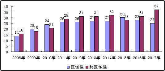 图表12 2008—2017年百亿级企业中跨区域企业与区域性企业数量(家)