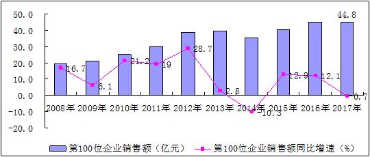 2017年零售百强入围门槛为44.8亿元,比2016年下降0.3亿元,第100位企业销售额比2016年第100位企业销售额低0.7%。