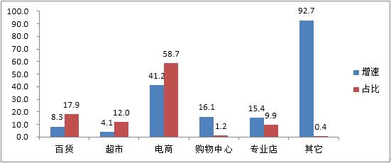 业态以专业店为主的企业有12家,销售规模占百强的9.9%,同比增速为15.4%,增速较2016年上升2.3个百分点;业态以百货为主的企业共有46家,销售规模占百强的17.9%,同比增速为8.3%,比上年加快5.0个百分点;业态以超市为主的企业共有25家,销售规模占百强的12.0%,同比增速为4.1%,比上年同期加快0.4个百分点;9家购物中心销售同比增长16.1%,增速比去年加快6.9个百分点,规模占百强的1.2%;而7家电商的销售增速同比增长41.2%,增速比去年同期提高7个百分点。