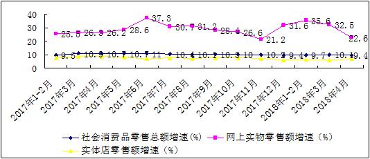 2017年以来各月网上实物商品零售额月度增速明显高于社会消费品零售总额月度增速及线下实体店零售额增速。