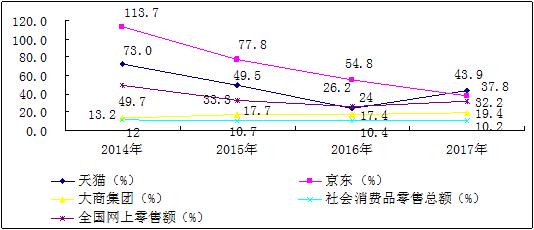 图表 5 2014年-2017年排名前三的企业销售规模增速及社会消费品零售总额和全网零售额增速对比