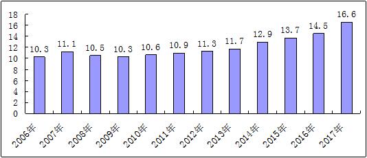 图表8 2006-2017年零售百强销售规模占社会消费品零售总额的比重(%)