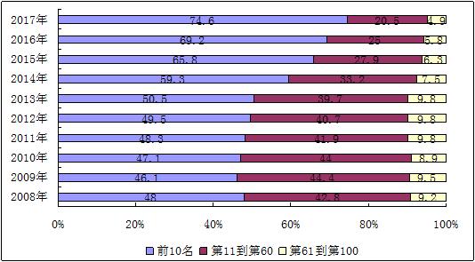 从增速对比来看,2017年前10位企业销售规模同比增长33.6%,比上年同期增长7.0个百分点,比百强整体增速高出7.6个百分点;第11至60位企业销售规模增速为7.8%,比上年同期提高4.5个百分点,低于百强整体增速18.2个百分点。第61至100位企业销售规模增速为8.3%,高于上年同期3.6个百分点,低于百强整体增速17.7个百分点。