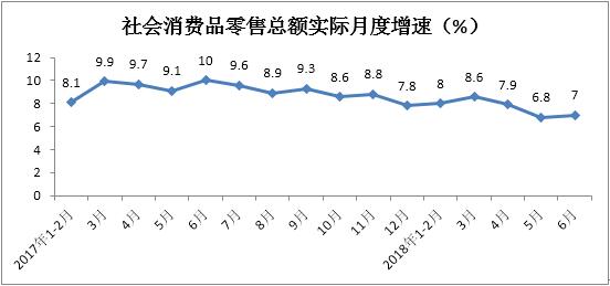 上半年,城镇消费品零售额实现154091亿元,同比增长9.2%,增速比去年同期回落0.9个百分点。其中,6月份城镇消费品零售额同比增长8.8%,增速较2017年同期放缓1.9个百分点。