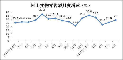 1-6月份网上实物商品零售额实现31277亿元,同比增长29.8%,增速比2017年同期加快1.2个百分点,对社会消费品零售总额增长的贡献率为46.4%,比2017年同期提高13.9个百分点,拉动社会消费品零售总额增长4.4个百分点,比2017年同期提高1.0个百分点。占社会消费品零售总额的比重为17.4%,比2017年同期提高3.6个百分点。4、5、6月份网上实物商品零售额分别同比增长22.6%、25.8%和29%,增速较2017年同期分别回落3.6、2.8和8.3个百分点。