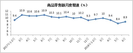 上半年,商品零售额实现160561亿元,同比增长9.3%,增速比2017年同期放缓1个百分点。其中6月份同比增长8.9%,增速较2017年同期放缓2个百分点。