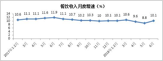 上半年,餐饮收入实现19457亿元,同比增长9.9%,增速较2017年同期放缓1.3个百分点。其中,6月份餐饮收入同比增长10.1%,增速较2017年同期放缓1.8个百分点。