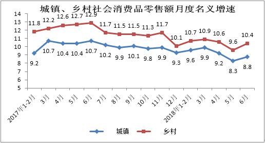上半年,乡村消费品零售额实现25927亿元,同比增长10.5%,增速比2017年同期放缓1.8个百分点。其中,6月份乡村消费品零售额同比增长10.4%,增速较2017年同期放缓2.5个百分点。