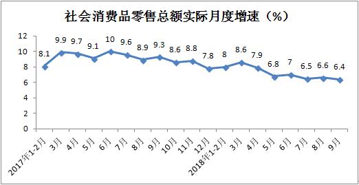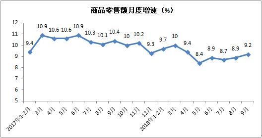 2018年前三季度社会消费品零售总额实现274299亿元,累计增长9.3%,增速与1-8月份持平。其中,9月份社会消费品零售总额实现32005亿元,同比增长9.2%,增速较上月加快0.2个百分点。月度同比增速自8月份连续两个月回升。