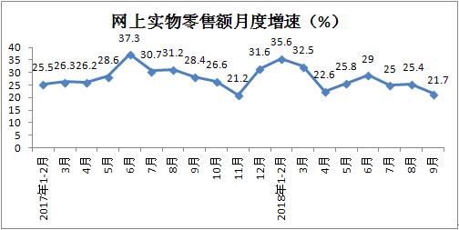 二、前三季度网上实物商品零售额增速累计增长27.7%,9月份增速较上月放缓3.7个百分点