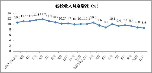 1-11月份,餐饮收入实现38294亿元,累计增长9.5%,增速较1-10月份放缓0.1个百分点。其中,11月份餐饮收入同比增长8.6%,增速较上月放缓0.2个百分点。
