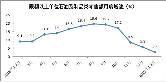 1-2月份限额以上单位石油及制品类零售额实现3030亿元,同比增长2.5%,增速较上年同期放缓6.6个百分点,较上年12月份放缓3.3个百分点,拉动社会消费品零售总额增长0.12个百分点。
