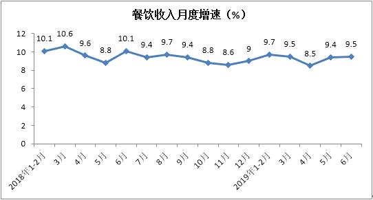 上半年餐饮收入实现21279亿元,累计增长9.4%,增速较1-5月份提高0.1个百分点。其中,6月份同比增长9.5%,增速环比提升0.1个百分点。