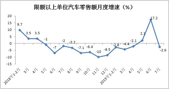 1-7月份限额以上单位汽车类零售额实现22147亿元,累计增长0.6%,增速较1-6月份放缓0.6个百分点。其中,7月份同比下降2.6%,在前期汽车消费透支因素的影响下,增速较上月大幅回落19.8个百分点。