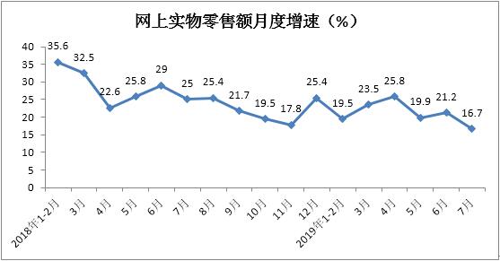 1-7月份网上实物商品零售额实现44233亿元,累计增长20.9%,增速较1-6月放缓0.7个百分点,对社会消费品零售总额增长的贡献率为43.7%,拉动社会消费品零售总额增长3.6个百分点,占社会消费品零售总额的比重达到19.4%。其中,7月份网上实物商品零售额实现6068亿元,同比增长16.7%,增速较上月放缓4.5个百分点,对社会消费品零售总额长的贡献率为37.2%,拉动社会消费品零售总额增长2.8个百分点,占社会消费品零售总额的比重达到18.3%。