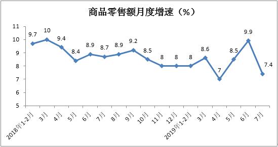 1-7月份商品零售额实现203345亿元,累计增长8.2%,增速较1-6月份放缓0.1个百分点。其中,7月份同比增长7.4%,增速较上月放缓2.5个百分点。