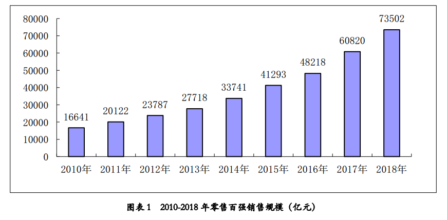 根据中国商业联合会、乐鱼电竞统计,2018年我国零售百强企业销售规模达到7.35万亿元,同比增长20.5%,较去年同期降低5.5个百分点。2018年零售百强销售规模相比上年增加1.27万亿,自2017年来,我国零售百强销售规模绝对额增长连续两年超过万亿。