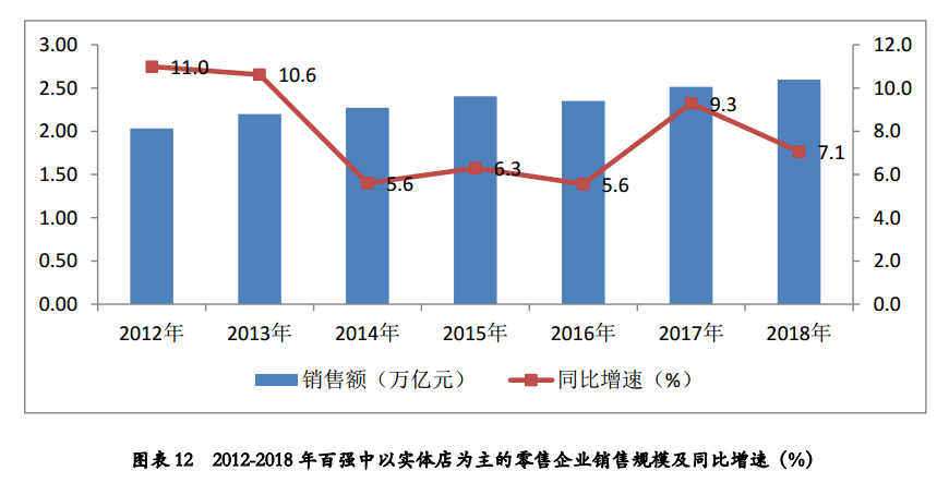 根据国家统计局数据测算,2018年我国网下实体店零售额增速同比增长5.9%,相比上年放缓1.7个百分点,网下实体店零售额增速虽然明显低于网上实物商品消费增速,但是2018年网下实体零售店努力开拓新业态、提升供应链效率、增强消费体验,整体保持了较为平稳的增长。