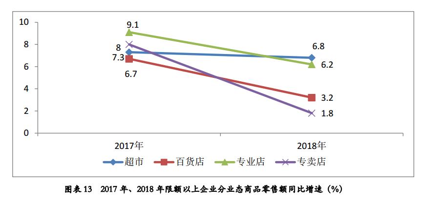 根据国家统计局数据,2018年,限额以上单位商品零售额中,超市、百货店、专业店和专卖店零售额比上年分别增长6.8%、3.2%、6.2%和1.8%,增速分别放缓了0.5、3.5、2.9和6.2个百分点。