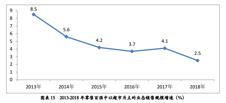 2018年,百强中以超市为主的业态同比增长为2.5%,增速低于上年同期1.6个百分点。百强中超市业态增速较低是因为线上超市、社区生鲜等新型超市业态的兴起,抢占了传统超市的市场份额,如盒马生鲜、每日优鲜2018年入围百强,且均实现了3位数的快速增长。