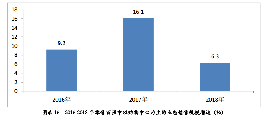 2018年,百强中以购物中心为主的业态销售规模增长明显放缓,同比增速为6.3%,增速相比去年同期放缓了9.8个百分点。以购物中心为主的业态在百强中的占比不到1%,对百强增长的贡献率为0.2%。