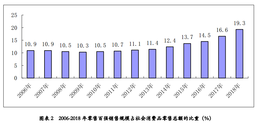 2018年中国零售百强销售规模的较快扩张,使得百强销售规模占社会消费品零售总额的比重进一步提升。根据乐鱼电竞的统计,2018年百强销售规模占社会消费品零售总额的比重为19.3%,比2017年提高2.7个百分点。