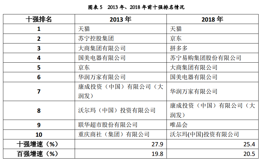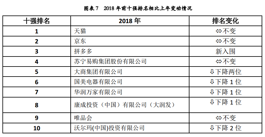 2018年入围零售百强的电商企业变换较大,拼多多、云集、每日优鲜等电商新业态迎合了新的潜在消费需求快速发展,为2018年新进入百强的企业。