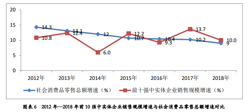 百强呈现明显的头部聚集效应,主要是由于自2012年开始百强中纳入电商企业,前十强企业如果剔除电商企业销售规模增速明显下降,2018年前十强中去除电商后,实体零售企业销售规模增速为10%,增速相比上年下降3.7个百分点,但仍高于社会消费品零售总额1.0个百分点。