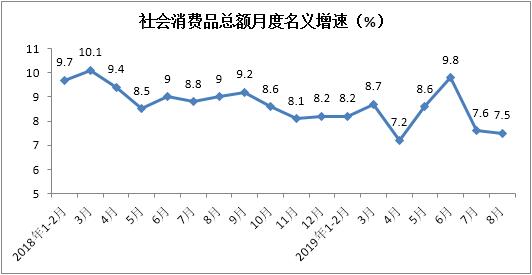 1-8月份我国社会消费品零售总额实现262179亿元,累计增长8.2%,增速较1-7月份放缓0.1个百分点。其中,8月份同比增长7.5%,增速较上月放缓0.1个百分点。