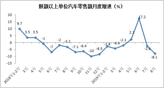 1-8月份限额以上单位汽车类零售额实现25123亿元,累计下降0.5%,增速较1-7月份放缓1.1个百分点。其中,8月份同比下降8.1%,降幅较上月扩大5.5个百分点。