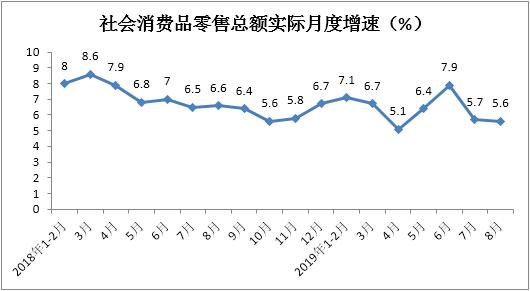 据测算,1-8月份实体店消费品零售额增长5.6%,增速较1-7月份放缓0.1个百分点。其中,8月份同比增长4.9%,增速较上月放缓0.9个百分点。