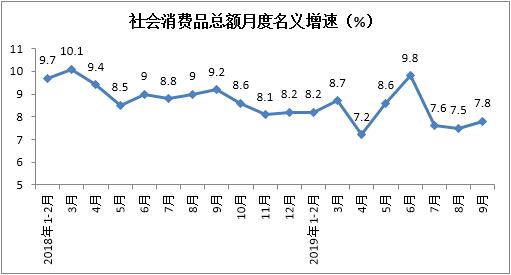 1-9月份我国社会消费品零售总额实现296674亿元,累计增长8.2%,增速与1-8月份持平。其中,9月份同比增长7.8%,增速较上月加快0.3个百分点。