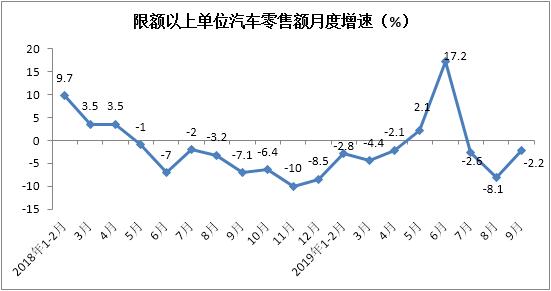 1-9月份限额以上单位汽车类零售额实现28528亿元,累计下降0.7%,降幅较1-8月份扩大0.2个百分点。其中,9月份同比下降2.2%,降幅较上月收窄5.9个百分点。