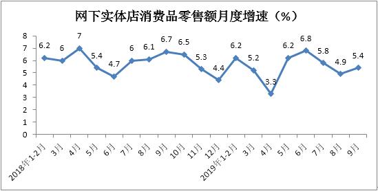 据测算,1-9月份实体店消费品零售额增长5.6%,增速与1-8月份持平。其中,9月份同比增长5.4%,增速较上月加快0.5个百分点。
