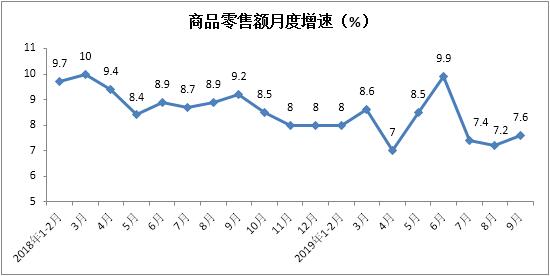 1-9月份商品零售额实现264109亿元,累计增长8%,增速较1-8月份放缓0.1个百分点。其中,9月份同比增长7.6%,增速较上月加快0.4个百分点。