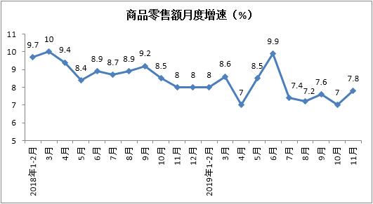 1-11月份商品零售额实现330976亿元,累计增长7.9%,增速与1-10月份持平。其中,11月份同比增长7.8%,增速较上月加快0.8个百分点。