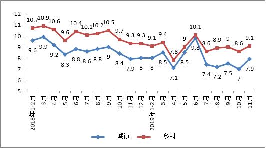 1-11月份城镇消费品零售额实现318614亿元,累计增长7.9%,增速较1-10月份持平。乡村消费品零售额实现54259亿元,累计增长9.0%,增速较1-10月份持平。其中,11月份城镇消费品市场增长7.9%,增速较上月加快0.9个百分点,乡村消费品市场增长9.1%,增速较上月加快0.5个百分点。