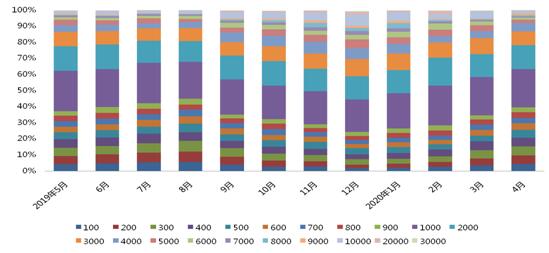 图6:2019年5月-2020年4月30家大型实体门店服装价位结构