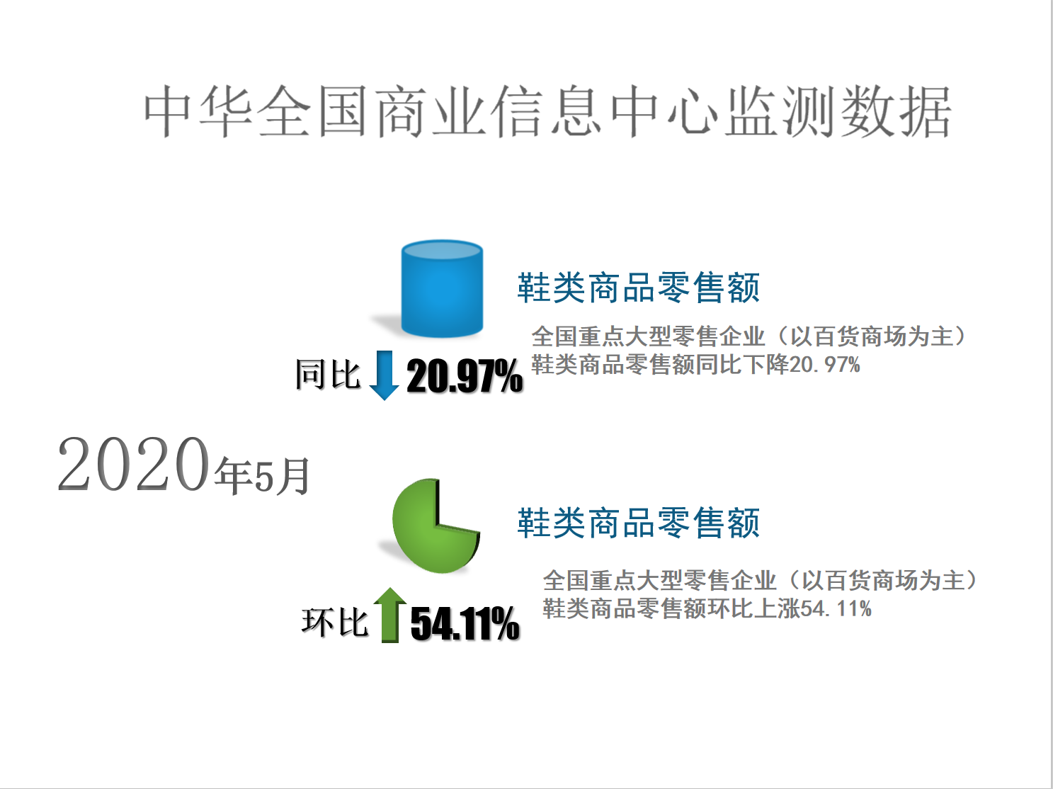 根据乐鱼电竞的监测数据, 2020年5月份全国重点大型零售企业(以百货商场为主)鞋类零售额同比下降20.97%,环比上涨54.11%。