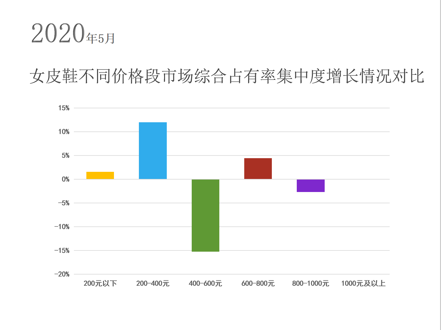 从5月份单月品牌数据来看,女皮鞋平均价格与去年同期相比略有降低,零售价集中在200-400元之间。平均价格在200-400元之间品牌综合占有率同比增长11.97个百分点,平均价格400-600元之间的品牌综合占有率同比下降15.25个百分点。