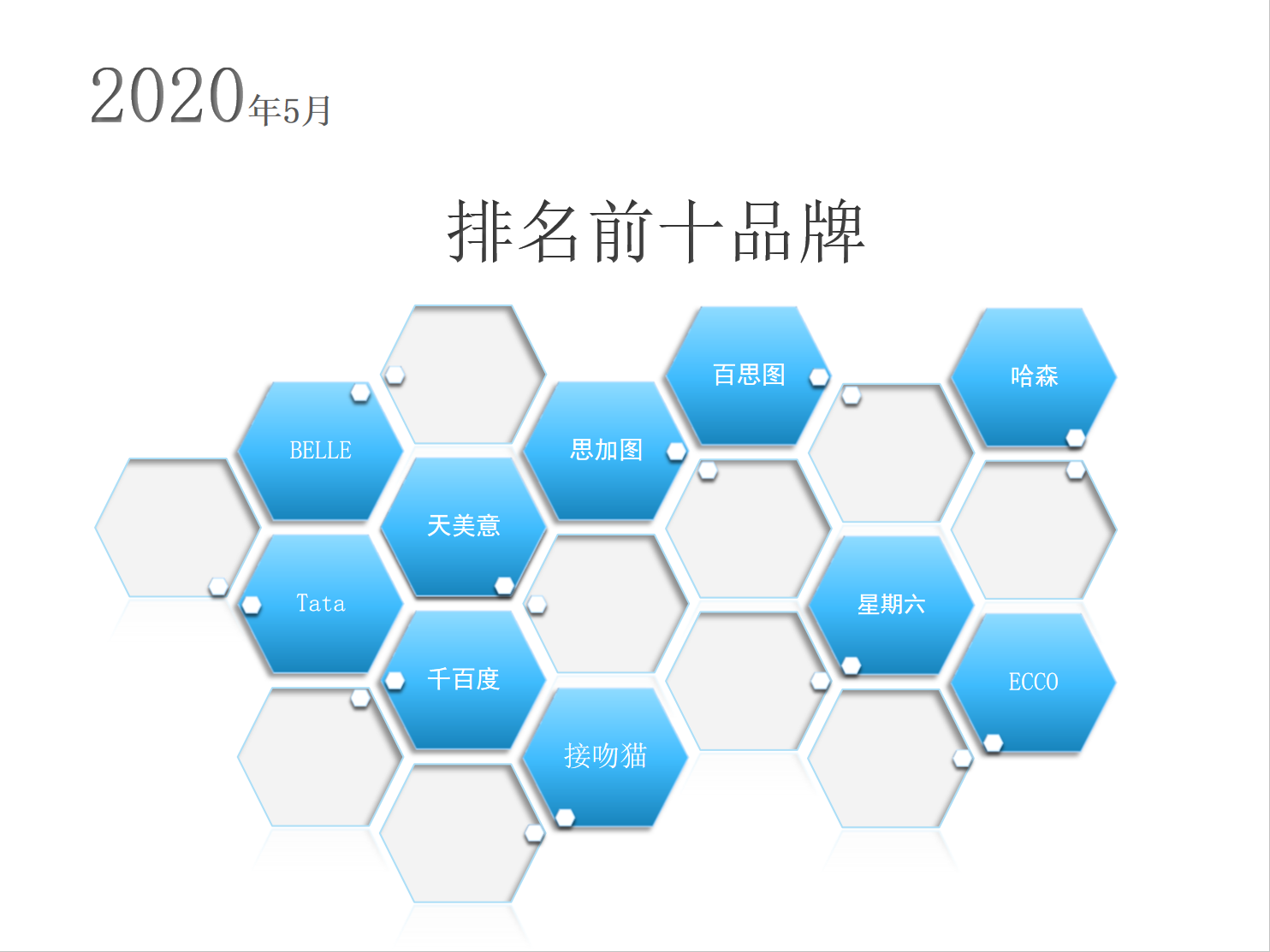 前十品牌包括BELLE、Tata、天美意、千百度、思加图、接吻猫、百思图、星期六、哈森、ECCO,市场集中度合计为34.71%,同比上涨1.47个百分点,环比下降0.27个百分点。