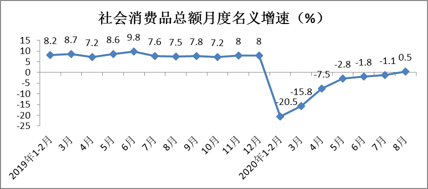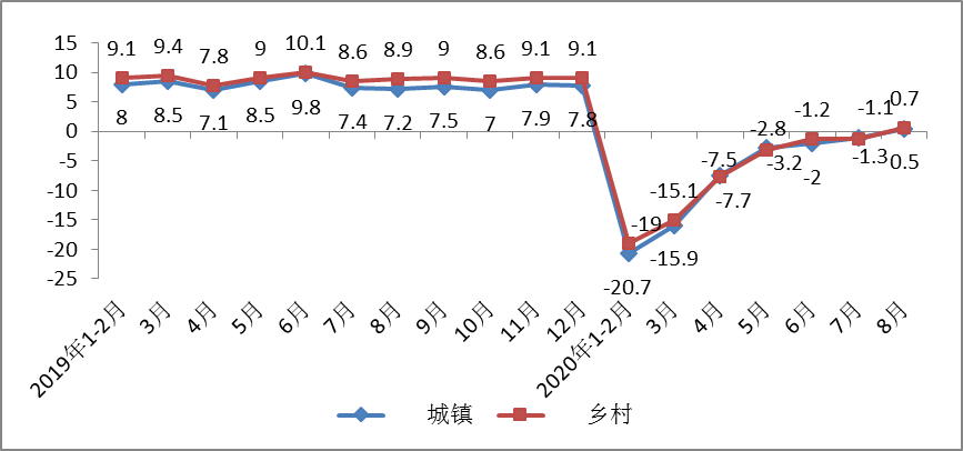1-8月份,城镇消费品零售额206643亿元,同比下降8.7%,降幅较1-7月份收窄1.3个百分点;乡村消费品零售额31386亿元,同比下降8.3%,降幅较1-7月份收窄1.2个百分点。其中,8月份城镇消费品零售额同比增长0.5%,增速环比提高1.6个百分点;乡村消费品零售额同比增长0.7%,增速环比提高2个百分点。