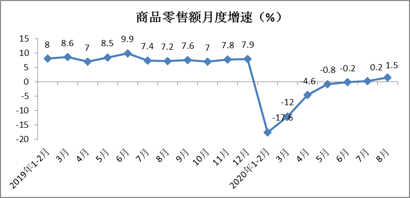 1-8月份,商品零售216519亿元,同比下降6.3%,降幅较1-7月份收窄1.2个百分点。其中,8月份商品零售29951亿元,同比增长1.5%,增速环比提升1.3个百分点。